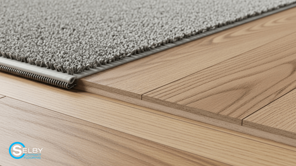A threshold strip or coordinating colour palette ensures the shift feels deliberate rather than accidental. Choose transition trims that complement both materials for a polished, professional finish.