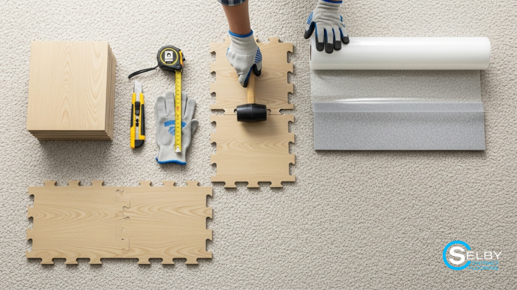 If the carpet is thick or plush, it’s best to place a plywood base or hardboard underlayment on top to create a firm surface. This support layer prevents movement and protects the carpet underneath. Once the base is ready, begin installing your chosen flooring material, such as vinyl planks, laminate boards, or interlocking tiles. Carefully align edges and leave a small expansion gap near walls. This ensures the flooring remains stable while still allowing natural movement.