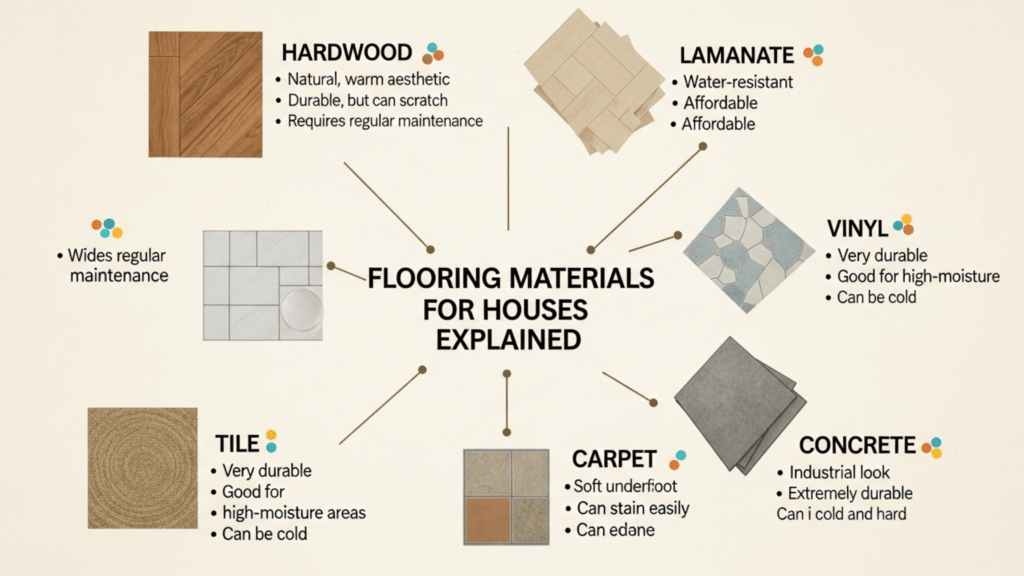 The most widely used materials include wood flooring, luxury vinyl plank, ceramic tile, laminate flooring, and carpet. Each material offers different levels of durability, comfort, and maintenance depending on where it is installed in the home.