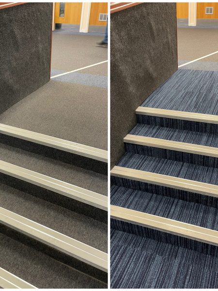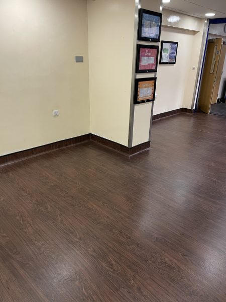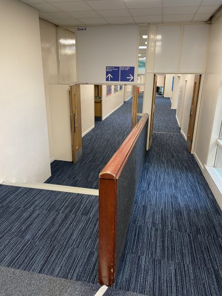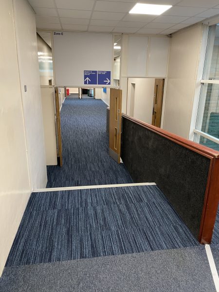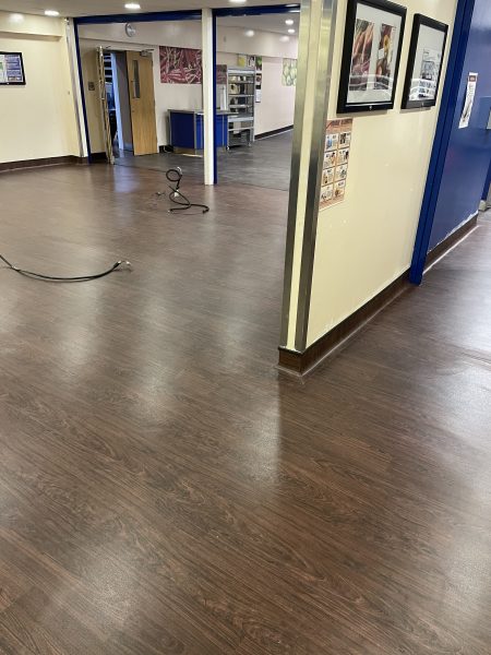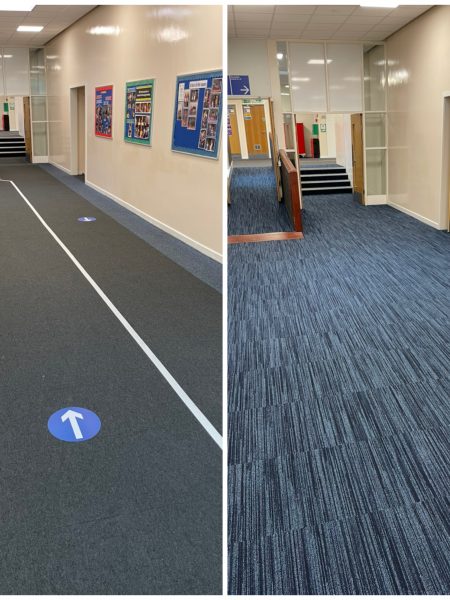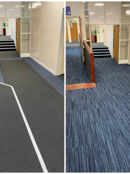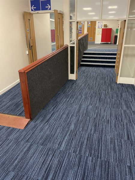 This project saw the Selby team up with our long term client to replace further areas of a large Academy including the canteen, corridors and classrooms. Polyflor Brazilian Walnut safety floor was fitted for an easy clean throughout the canteen area along with Modulyss Groove Blue 575 carpet tiles fitted along the corridors to add a splash of colour. The stunning pattern creates an illusion of a larger area and allows for any spillages to be hidden, the pupils are very proud of their school. The Selby team will be back during the next school holidays to carry out further works.
