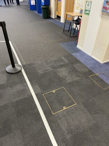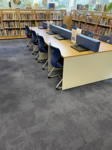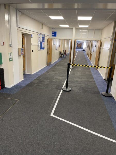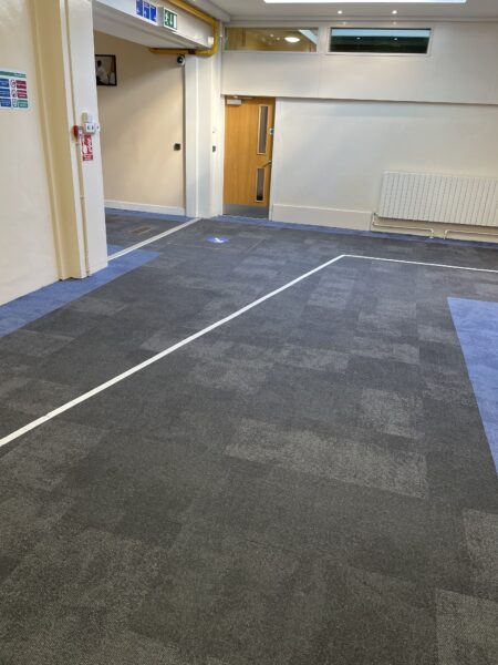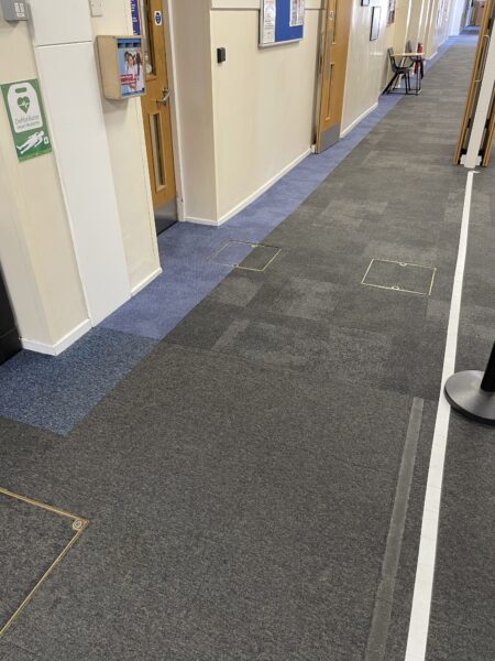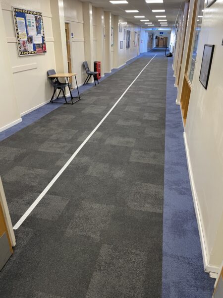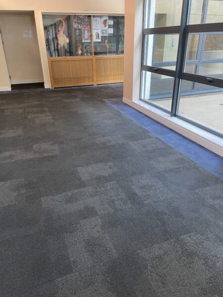 This project saw Selby team up with our long term client Ashcroft Academy to replace further areas including the reception, classrooms and corridors. Interface carpet tiles and EMS matting were used to provide a modern finish whilst also being able to abstain the large footfall. The stunning blue border runs throughout the academy creating a seamless, professional look that the pupils are proud of. The work was able to be carried out during various holidays to avoid any hassle!