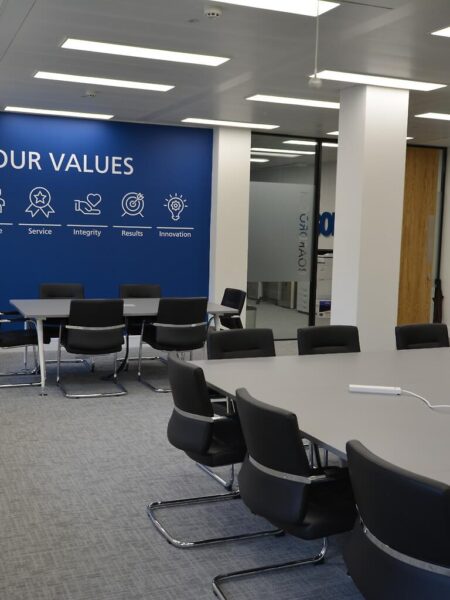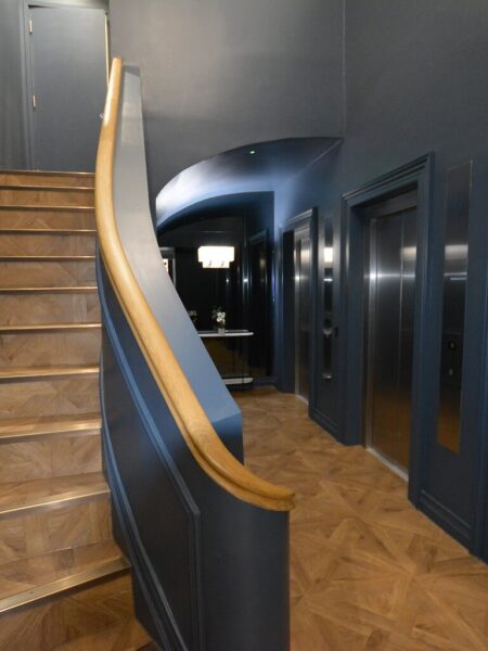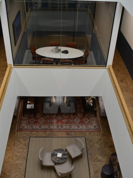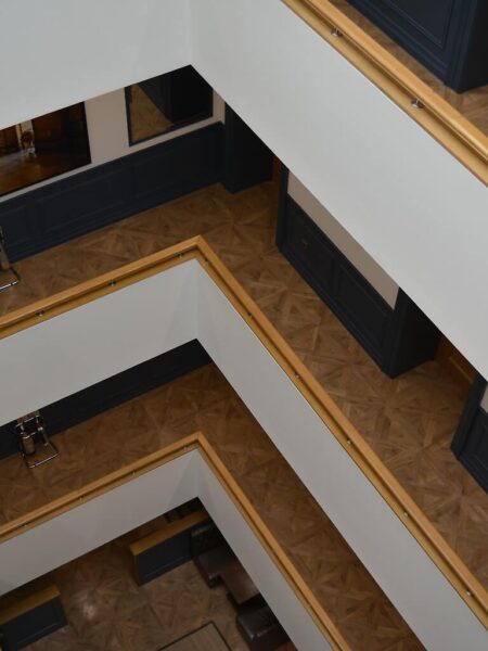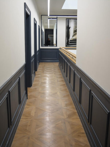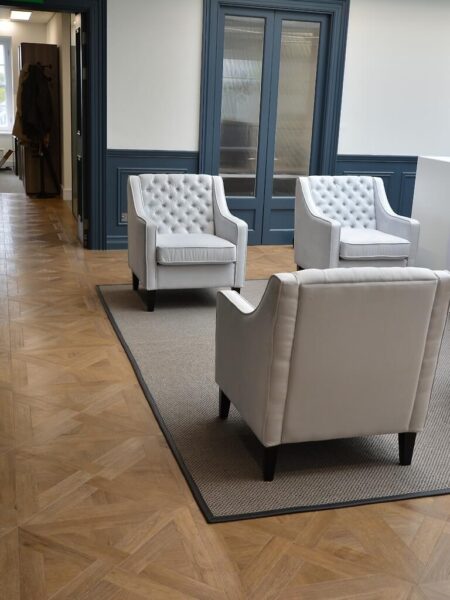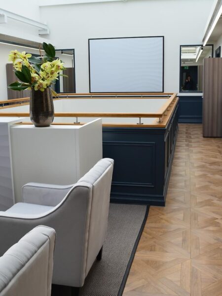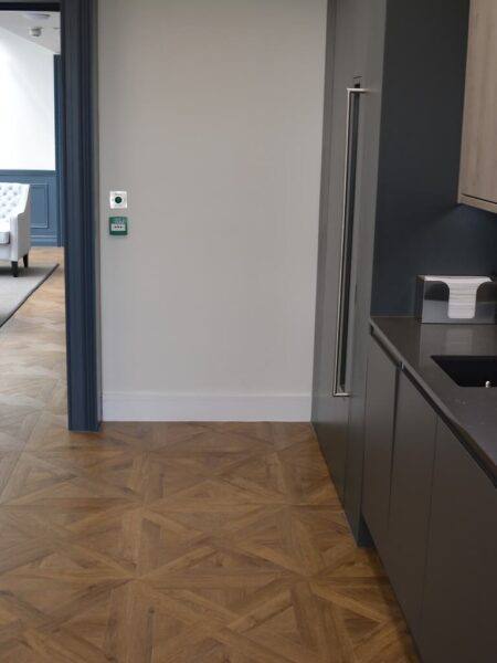 This project saw Selby team up with our long term partners Bourne office space to assist them with this stunning refurbishment at 70 Pall Mall. This was a really tricky project installing Amtico French Weave panels around the entire Atrium space over 5 floors and getting it all to meet up perfectly. This took some real-time skill from our installation teams but as usual, they did not disappoint. Each panel of the Amtico French Weave consists of 16 different pieces of vinyl that have to be pain painstakingly put together on-site but as you can see this showcases what an amazing look that you can achieve in the right environment with this product. In the offices and staircase, our client opted once again for their favourite carpet tile and Selby’s all-time best seller Milliken Nordic Stories Tectonic which looks absolutely amazing.