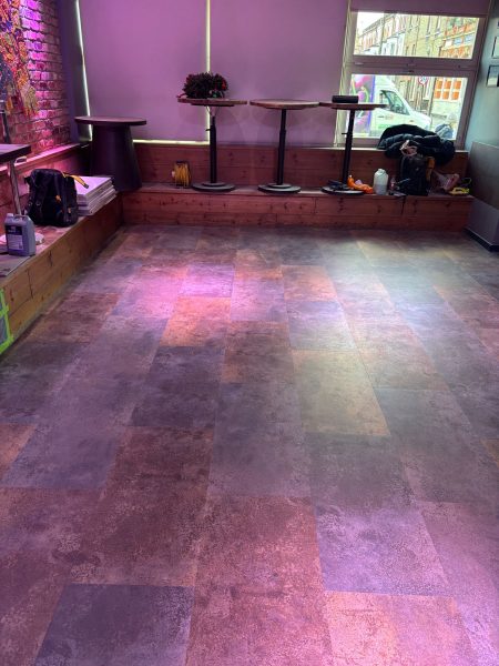 A recent project update at Cafe Sol, located at 56 Clapham High Street, saw the installation of Comm Floor LVT Workshop 55 flooring in the stunning colors Oxyde Brown and Oxyde Bronze Red.