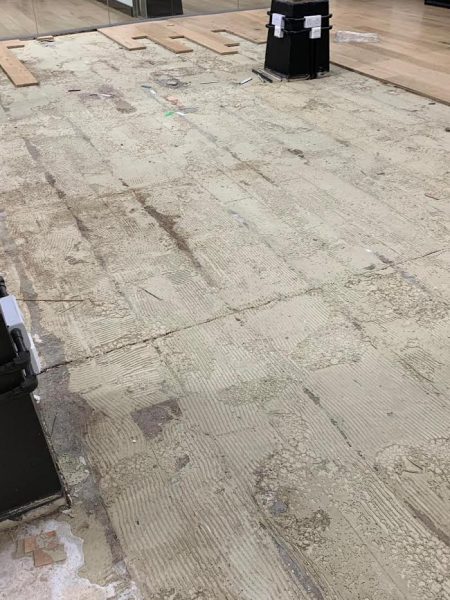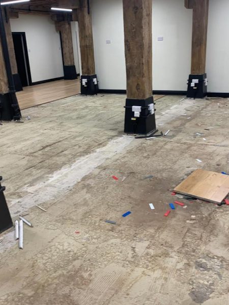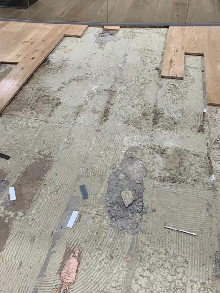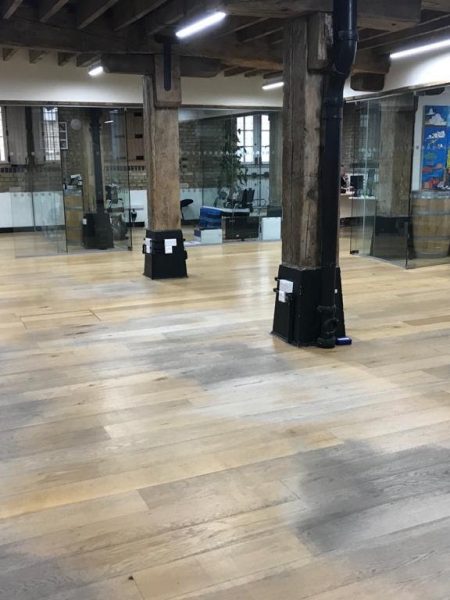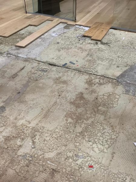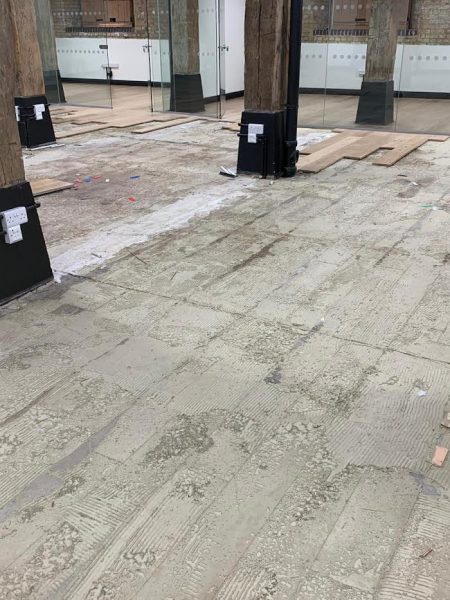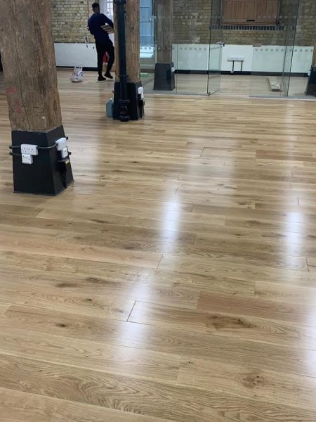 Take a look at the before, during, and after images of a recent project located at Shad Thames, SE1. The existing wood floor was uplifted and disposed of to be replaced by Lacquered Engineered Rustic Oak wood flooring on underlay using the manufacturer’s recommended adhesive. The flooring was then framed with a perimeter trim to allow for expansion. The results are stunning!