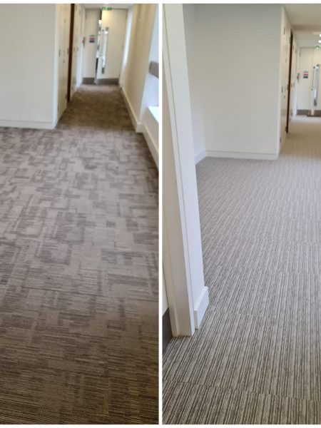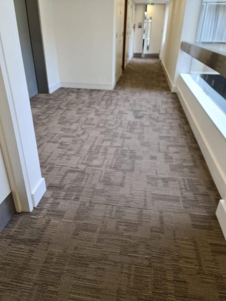 The Selby installation team uplifted and disposed of the existing broadloom carpet to transform the once dull space. Interface Yuton carpet tiles in the colour Biscuit were fitted to the 1st floor lift lobby to brighten up the space and result in a modern and professional finish.