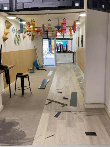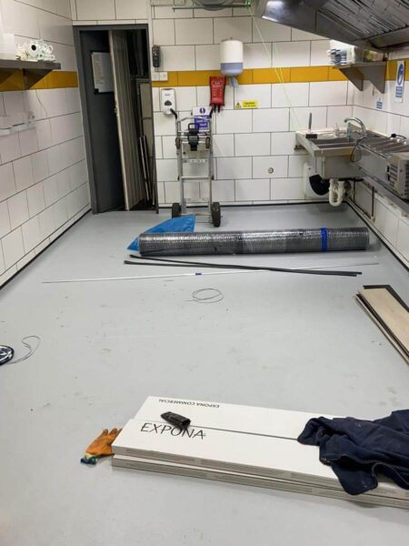 The Selby installation team uplifted and disposed of the existing vinyl, rubber, and LVT to prep the subfloor for the new flooring. Polyflor Expona Commercial Wood PUR in the colour Everest Oak was installed throughout the restaurant to allow for easy cleaning and maintenance. The final result looked great!