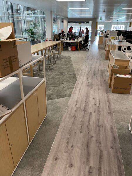 The Selby installation team transformed this central London serviced office. IVC Matrix Freelay LVT herringbone in the colour European Oak was fitted throughout the breakout area along with IVC Creative Spark carpet tiles added to create a striking border. The LVT was also installed across a number of levels to create a walkway amongst the existing carpet tiles. Additinal workspaces, kicthen areas and lift lobbies were also completed. The client was thrilled with the end result and have invited team Selby back to complete further areas. Well done team Selby!
