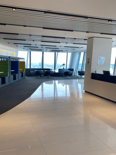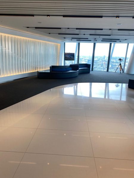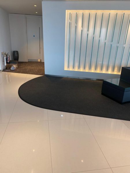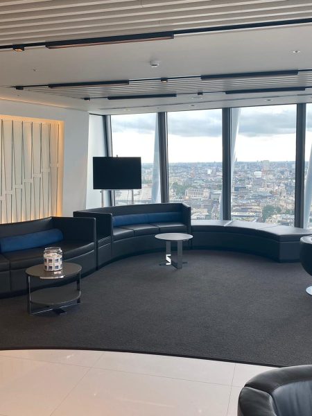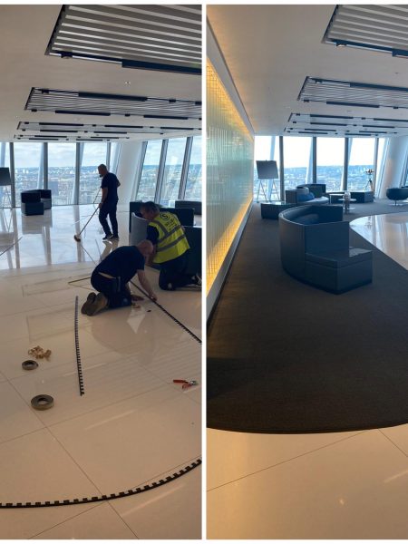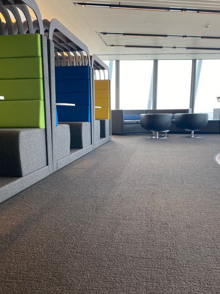 The Selby team worked on a reception area at the well-known Walkie Talkie building located in the heart of central London. The client wanted a carpeted area where they could install meeting pods whilst also breaking up the large white areas to create a less clinical space. Milliken carpet tiles were installed to create a sweeping curve to match the unique space of the floor. We are able to keep the porcelain tiles protected so they could restore them without any glue residue. Another great transformation by the Selby team.