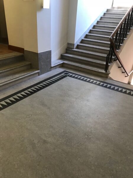 The brief was simple. Replace the flooring like-for-like for the flooring that had been down since the block was built. We used Forbo Marmoleum with all the borders being pre-cut into shapes before delivery and then re-cut on-site by our expert installation teams to make sure every triangle was the same size and met exactly with every corner block. As always with borders and design work the install was painstakingly slow but the result as you can see is perfection.